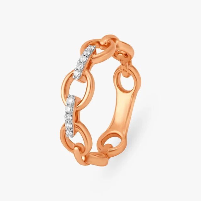 Expertly crafted in gleaming metal, the ring features interconnected links, each accented with brilliant diamonds that catch the light beautifully from every angle. The open-link design gives the ring a sense of fluidity and modern elegance, while the precise diamond setting ensures maximum brilliance and durability.